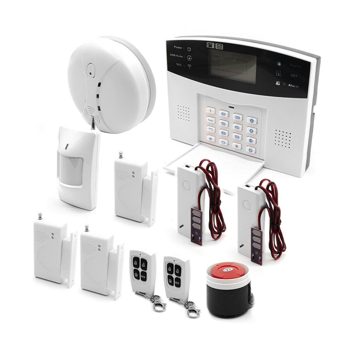 Комплексная система с сиреной и датчиками движения, температуры, дыма и открытия. Имеет комбинированное питание (сеть + аккумулятор) и отправляет SMS при отключении любого из источников.