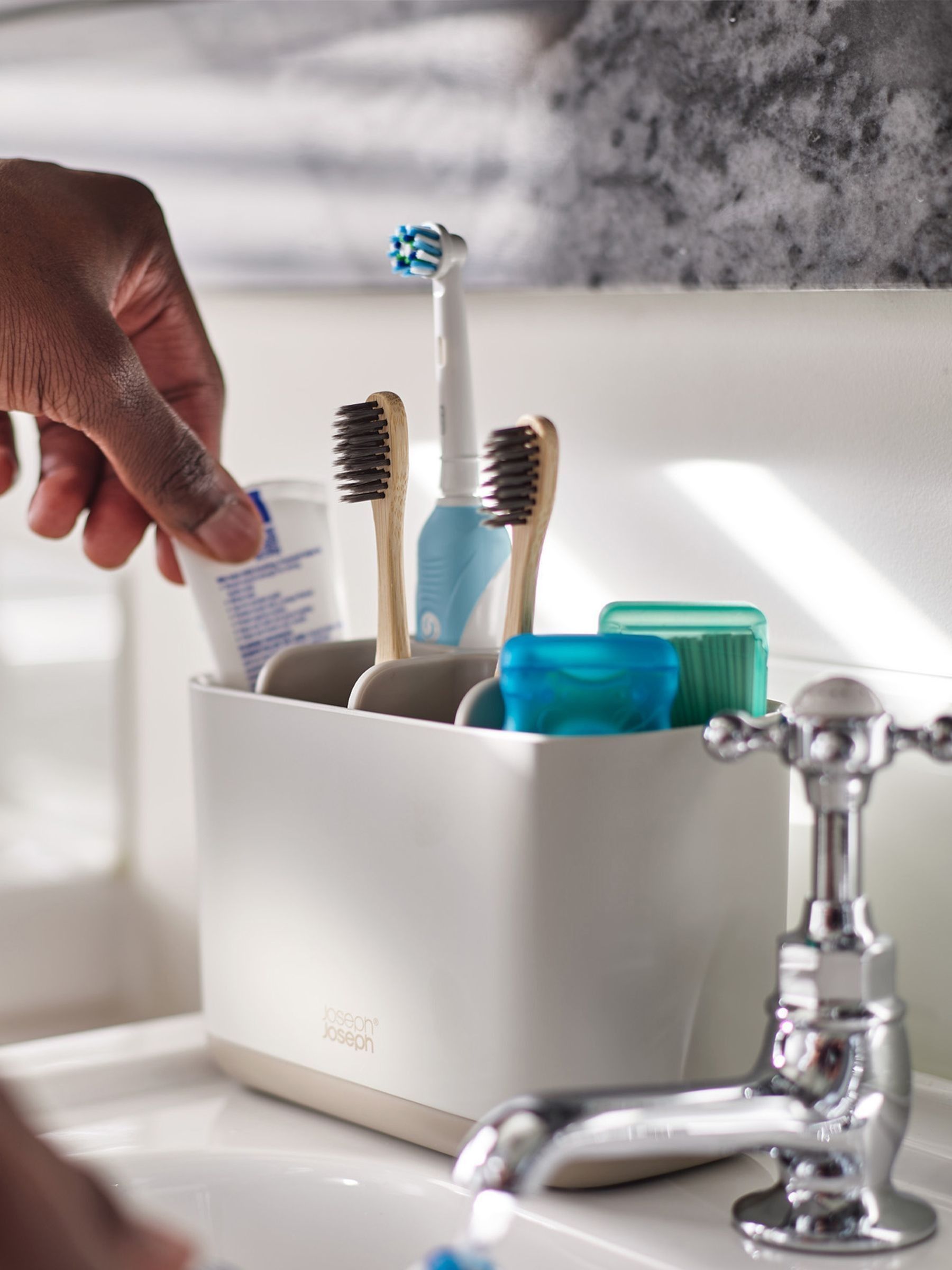 Для консерваторов существуют классические настольные варианты, такие как стильный стакан Joseph Joseph Easystore из экологичного пластика, обеспечивающий вертикальное проветривание щеток.