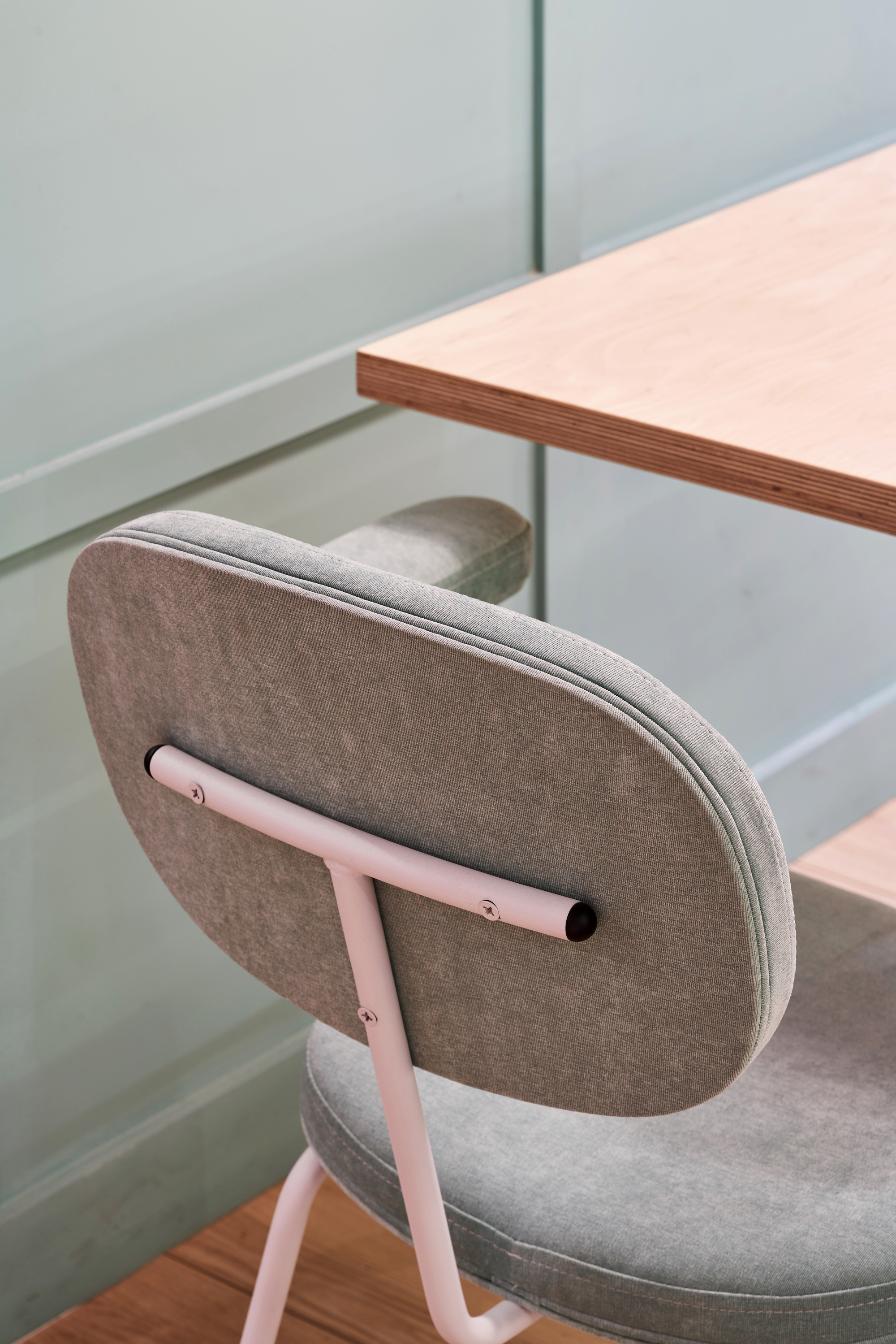 Интерьер построен на принципах открытости и простоты. Пространство четко разделено на функциональные зоны, предназначенные для разных сценариев посещения. Здесь представлено разнообразие вариантов посадки гостей, а значительную часть площади занимает открытая кухня, которая становится активным элементом интерьера. Ключевым инструментом для зонирования послужили легкие перегородки из металлокаркаса с вставками из полупрозрачного рельефного стекла, создающие интересные световые эффекты. Чтобы смягчить их графичную строгость, дизайнеры добавили струящиеся шторы из светло-молочного хлопка, добавляющие помещению воздушности.