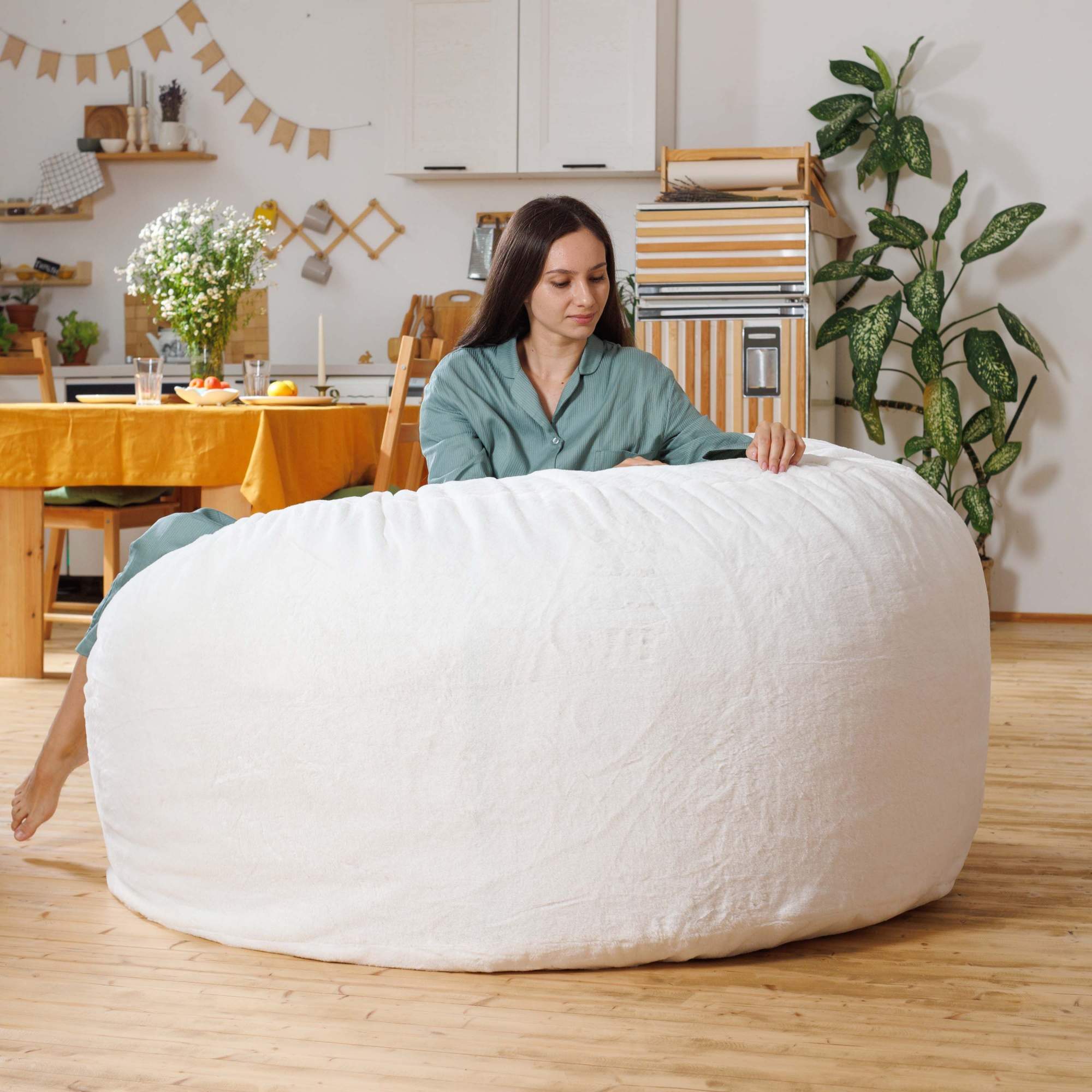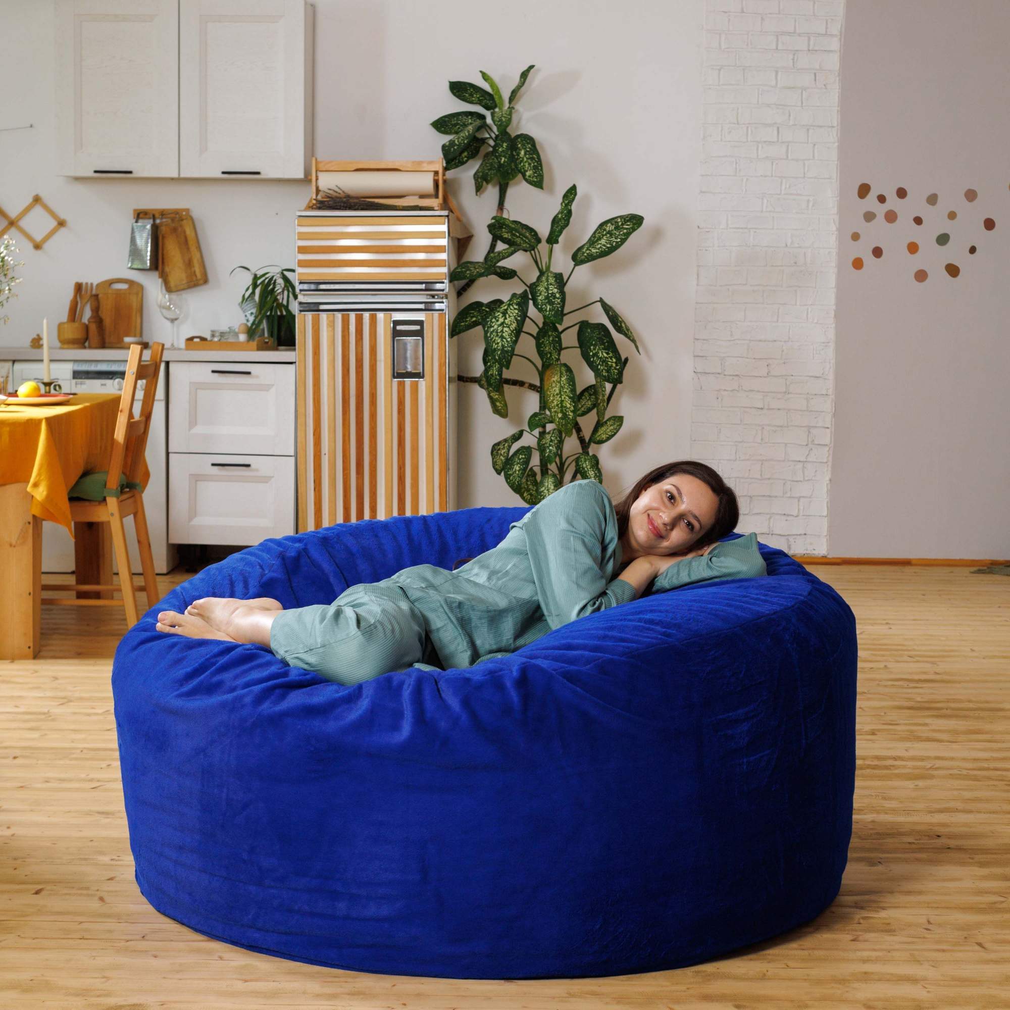 - XXL (до 110 см в высоту, до 100 см в ширину) — лучший выбор! Такой пуф позволяет с комфортом разместиться вдвоем или даже втроем, принимая любую расслабленную позу.