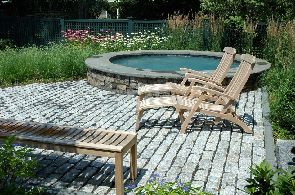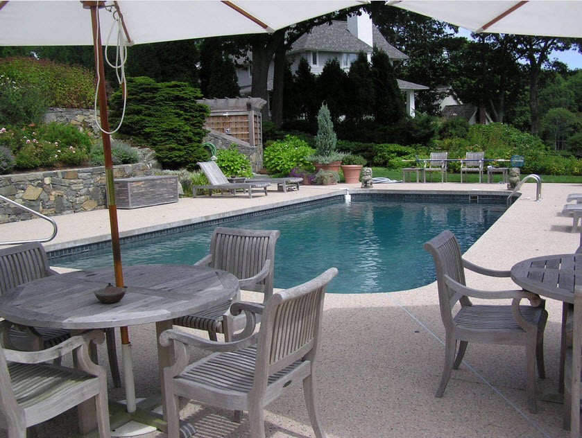 Второй важный элемент — выбор материалов, из которых должен быть сделан бассейн. Он может быть изготовлен из железобетона, который является очень прочным, а также полиэфирных и стальных листовых смол. Не стоит забывать про надувные виды бассейна, которые можно легко переносить в разные уголки сада.