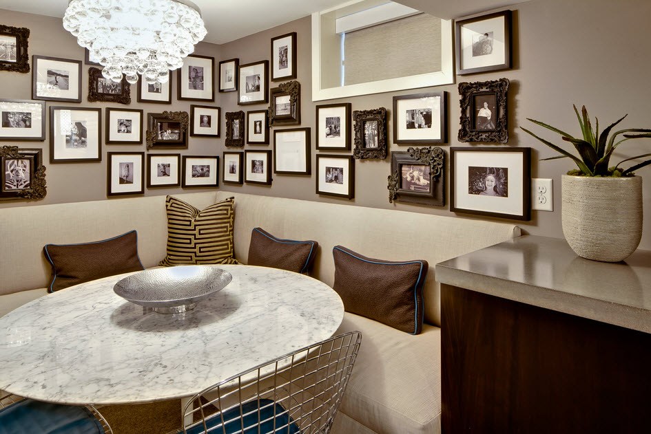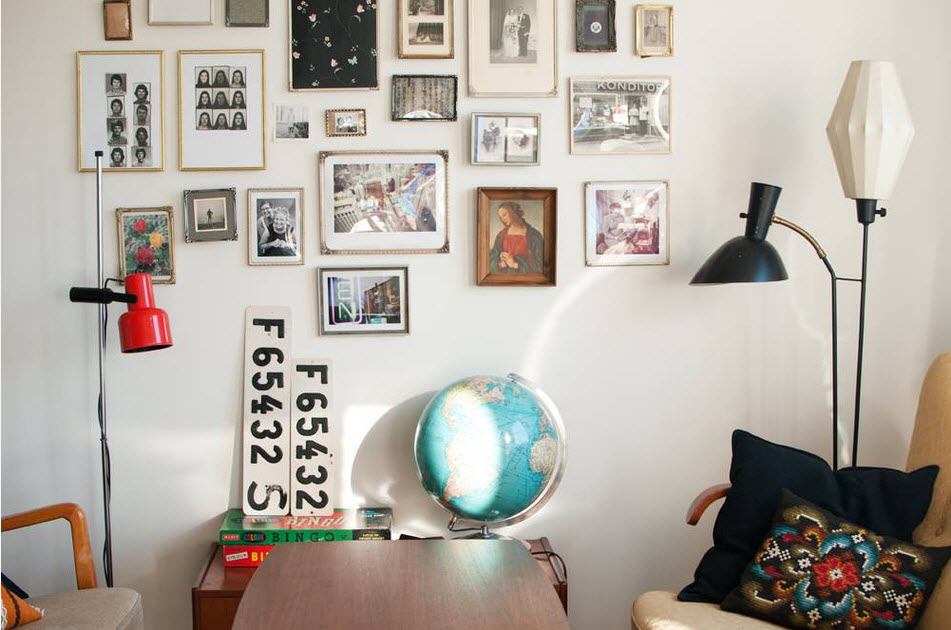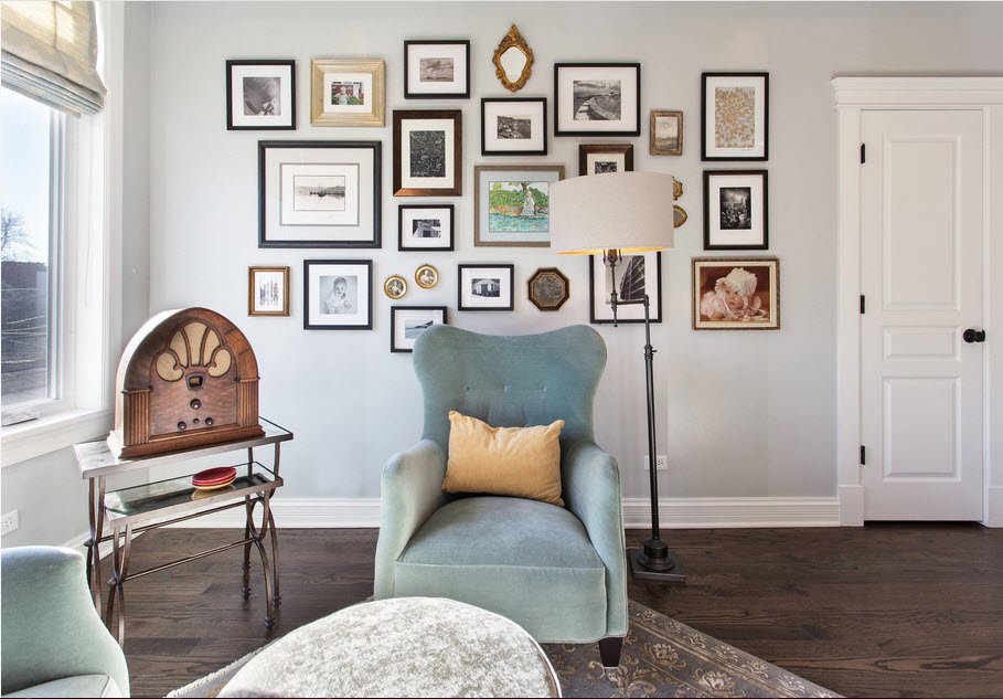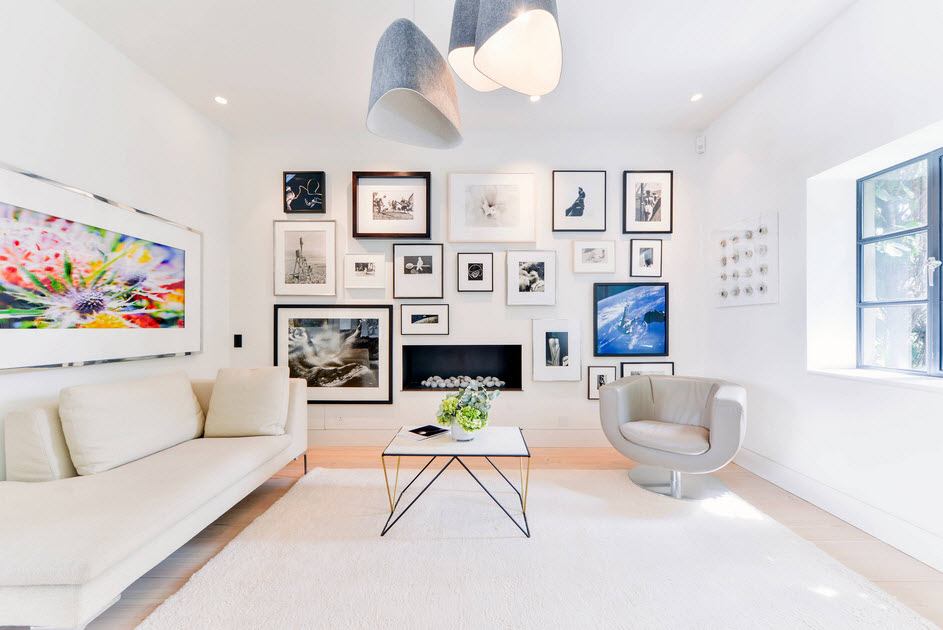 Поистине эффектную галерею на стене можно создать из фотографий в сочетании с картинами, гравюрами, постерами. Здесь можно проявить фантазию, подбирая интересные асимметричные сценарии и миксуя произведения искусства разных жанров.
