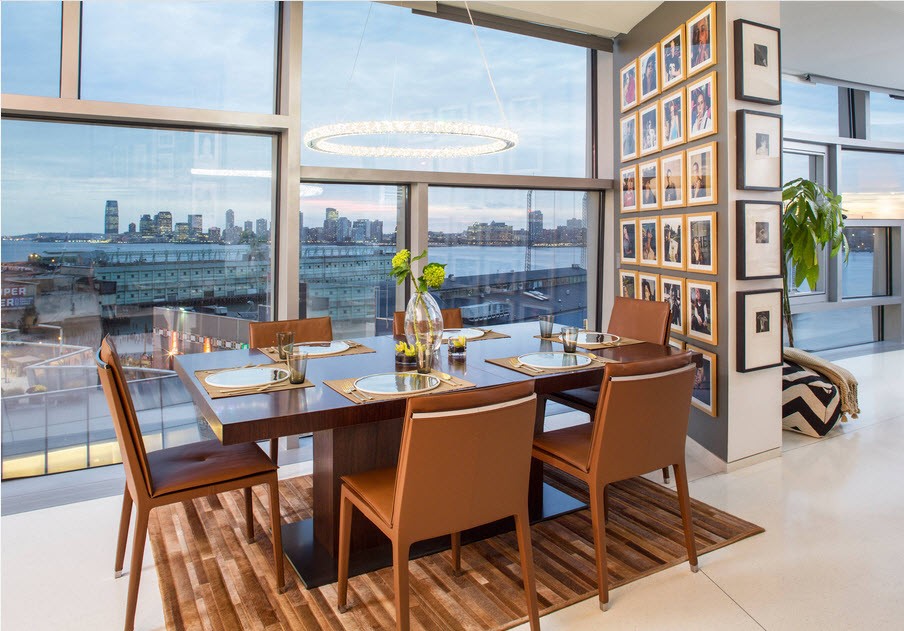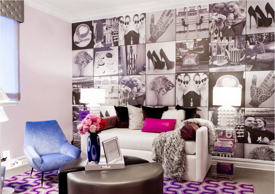 Фото на одной стене, приклеенные сплошным полотном встык — еще один дизайнерский ход, заменяющий декор стены обоями. Безусловно, такое решение смотрится очень необычно, современно, эффектно, но только если соблюдены все правила стиля и органичного сочетания с остальными элементами интерьера.