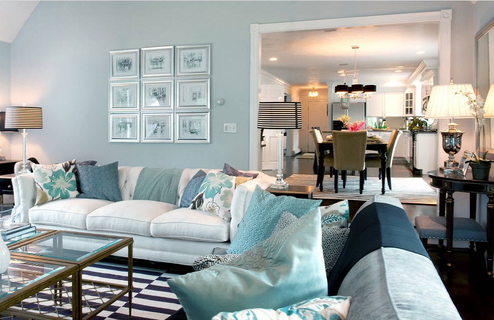 Для декора стены фотографиями или картинами можно выбрать беспроигрышный метод симметричного расположения, но в более динамичном ключе. Интересный пример представлен ниже на фото, где композиция из 7 иллюстраций напоминает по форме бант с крупным элементом в центре. Чтобы не допустить визуального хаоса, хозяева подобрали небольшие по размеру изображения и темные одинаковые рамки, которые прекрасно гармонируют с цветом мебели.