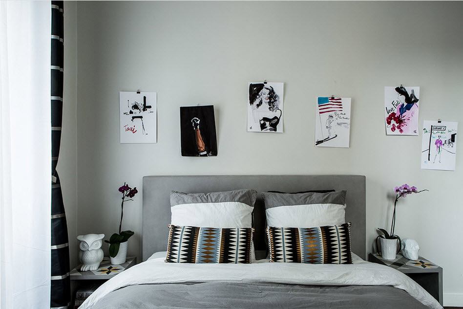 А в этой спальне вместо идеальной композиции на стене хозяева решили развесить картины неровно и без рам. Такой подход наполняет пространство свободой и динамикой.