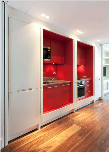 Помещение кухни может быть чересчур компактным – настолько, что его можно и не заметить. Для маленькой квартиры-студии или комнаты в коммуналке дизайнеры продумали самую скромную, но оптимальную конфигурацию из всех возможных: три шкафа для продуктов и посуды, мойка и микроволновка. Весь этот функционал накрывается крышкой (при необходимости) и превращается в неброский и даже симпатичный комод, совершенно не портящий дизайн жилого пространства. Конечно, такую кухню вряд ли можно назвать полноценной, но для студента или холостяка – прекрасный вариант.