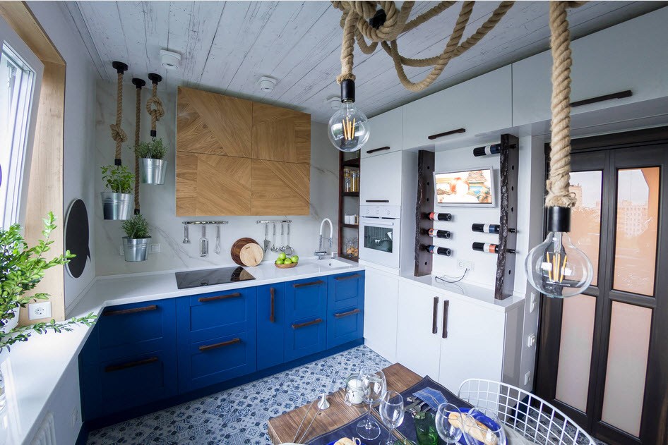 Чтобы освежить интерьер, в общую композицию добавлены средиземноморские акценты в виде плитки и синей палитры, а вместо верхних шкафов над рабочей зоной предусмотрен куб из массива с завораживающей подсветкой.