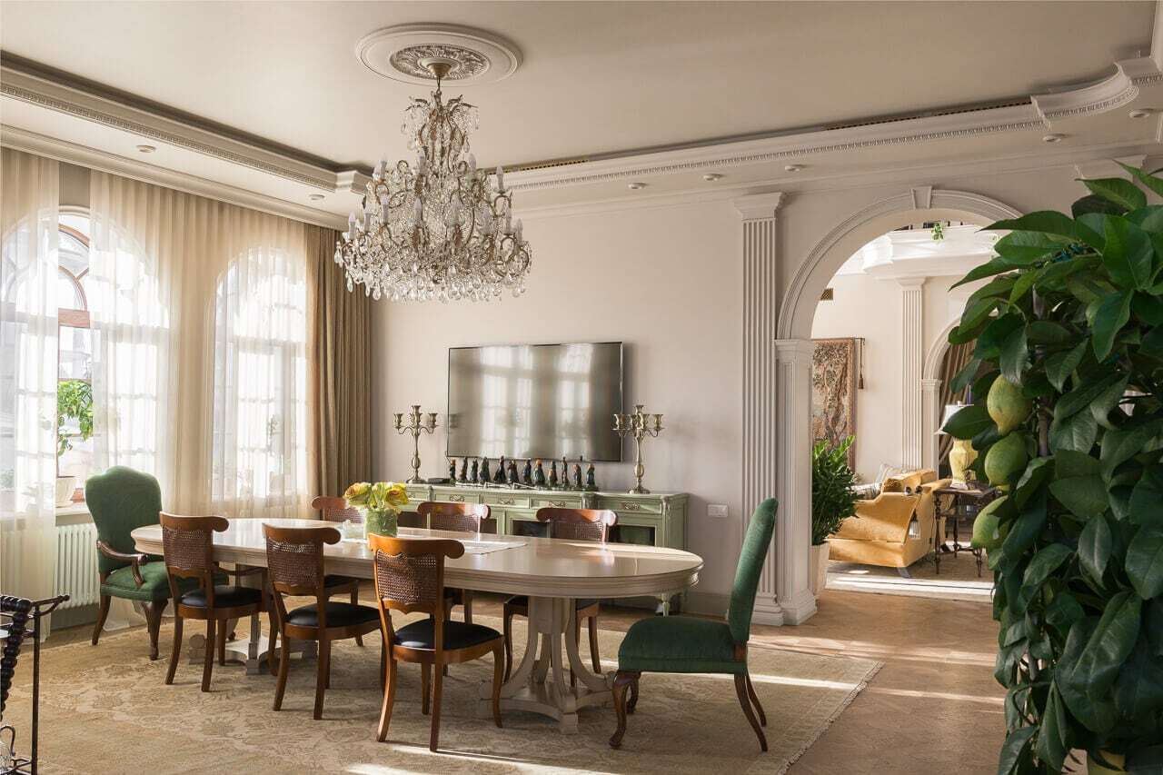 С помощью полуколонн можно достичь визуального эффекта поднятия потолка. Впрочем, любой вертикальный декор отлично справляется с этой задачей. Конструкция может прикрыть дефекты стен, за ней удобно прятать всевозможные коммуникации (трубы, провода).