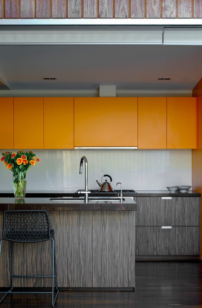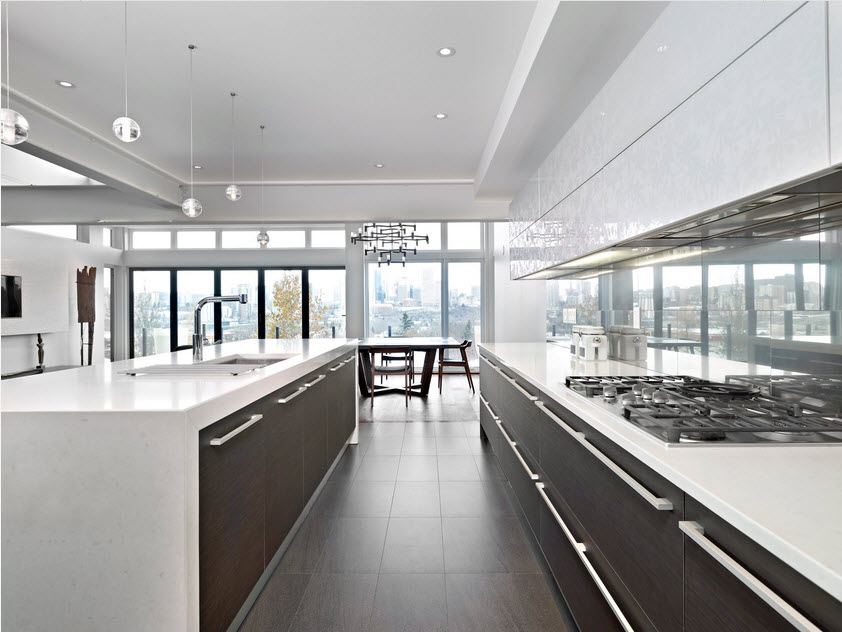 Сенсорные ручки – ультрамодная фурнитура оснащена светодиодами. Прикасаясь к таким ручками, вы получите мягкое, изысканное свечение. Такое оформление наполнит кухню волшебной таинственной атмосферой. Освещение может быть разным – от фасада, затрагивая прилегающие стороны, и внутри, подчеркивая неординарную красоту современного кухонного интерьера.