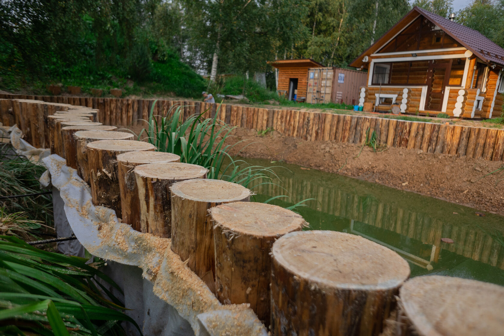 Для более крутых берегов или участков с подвижным грунтом отлично подходит укрепление с помощью дерева. Ключевой момент — правильный выбор породы. Наилучшими характеристиками обладают дуб и лиственница. Эти породы, особенно при постоянном контакте с водой, не гниют, а, наоборот, набирают прочность (так называемый «морёный дуб»). Историческим подтверждением долговечности лиственницы служит её использование при закладке фундаментов зданий в Санкт-Петербурге, многие из которых стоят до сих пор. Из такого дерева сооружают сваи, стенки или целые террасы.