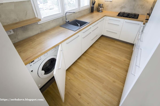 Кухня, выполненная в форме буквы «U», стала просторной и светлой. Вдоль стены, смежной с санузлом, расположились высокие шкафы для кладовки, холодильник и духовой шкаф. Варочная панель, раковина у окна и столешница создали эргономичный рабочий треугольник. Стиральная машина, перенесенная из ванной, была встроена в кухонный гарнитур. Открытая полка между опорным столбом и стеной визуально отделяет кухню от гостиной, сохраняя ощущение единого пространства. Рядом с кухней разместился обеденный стол на четырех человек, а в зоне отдыха — просторный диван и телевизор.