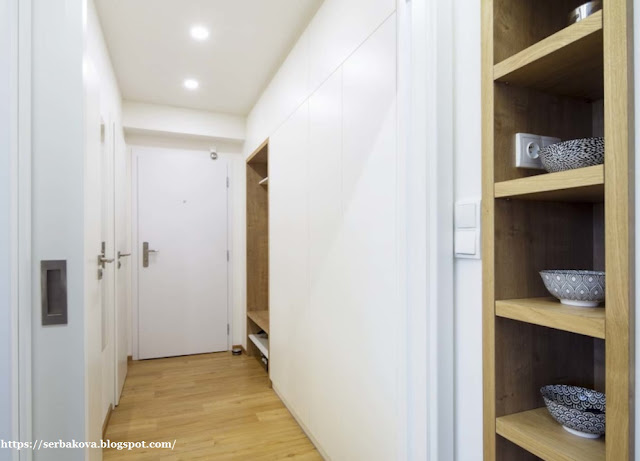 Проект реконструкции кардинально изменил пространство. Была создана удобная гостиная, объединенная с просторной кухней, и две отдельные комнаты. В прихожей архитекторы предусмотрели практичную систему хранения: вдоль всей стены разместились встроенные белые шкафы, которые, благодаря цвету и дизайну, не выглядят громоздко. У входа обустроена ниша с обувным шкафом и вешалкой из дубовых досок, что добавило уюта и функциональности.