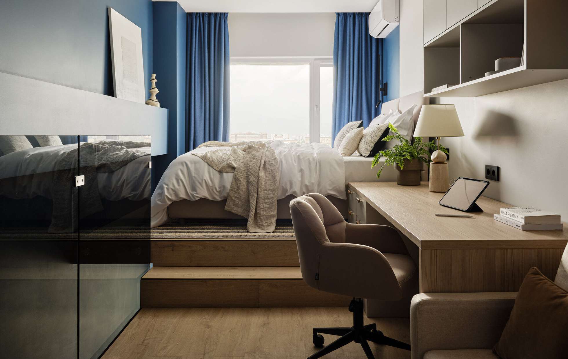 В небольшой спальне пространство использовано максимально эффективно. Напротив кровати находится большой встроенный шкаф, а пространство у окна между опорной колонной и стеной заняла многофункциональная тумба для белья, которая также служит прикроватным столиком. Ванная комната, сохранив прежние размеры, была полностью переосмыслена. Небольшую ванну заменила просторная душевая кабина во всю ширину комнаты. Дизайн выполнен в лаконичной гамме: белая пластиковая плитка на стенах и серая плитка «под бетон» на полу. Черно-белый узор использован в качестве акцента в прихожей и в нише за унитазом. Для хранения предусмотрена тумба под раковиной и встроенный зеркальный шкафчик. Технические элементы, такие как трубы отопления, были обыграны — их покрасили в черный цвет, превратив в дизайнерскую деталь. Туалет остался отдельным помещением.