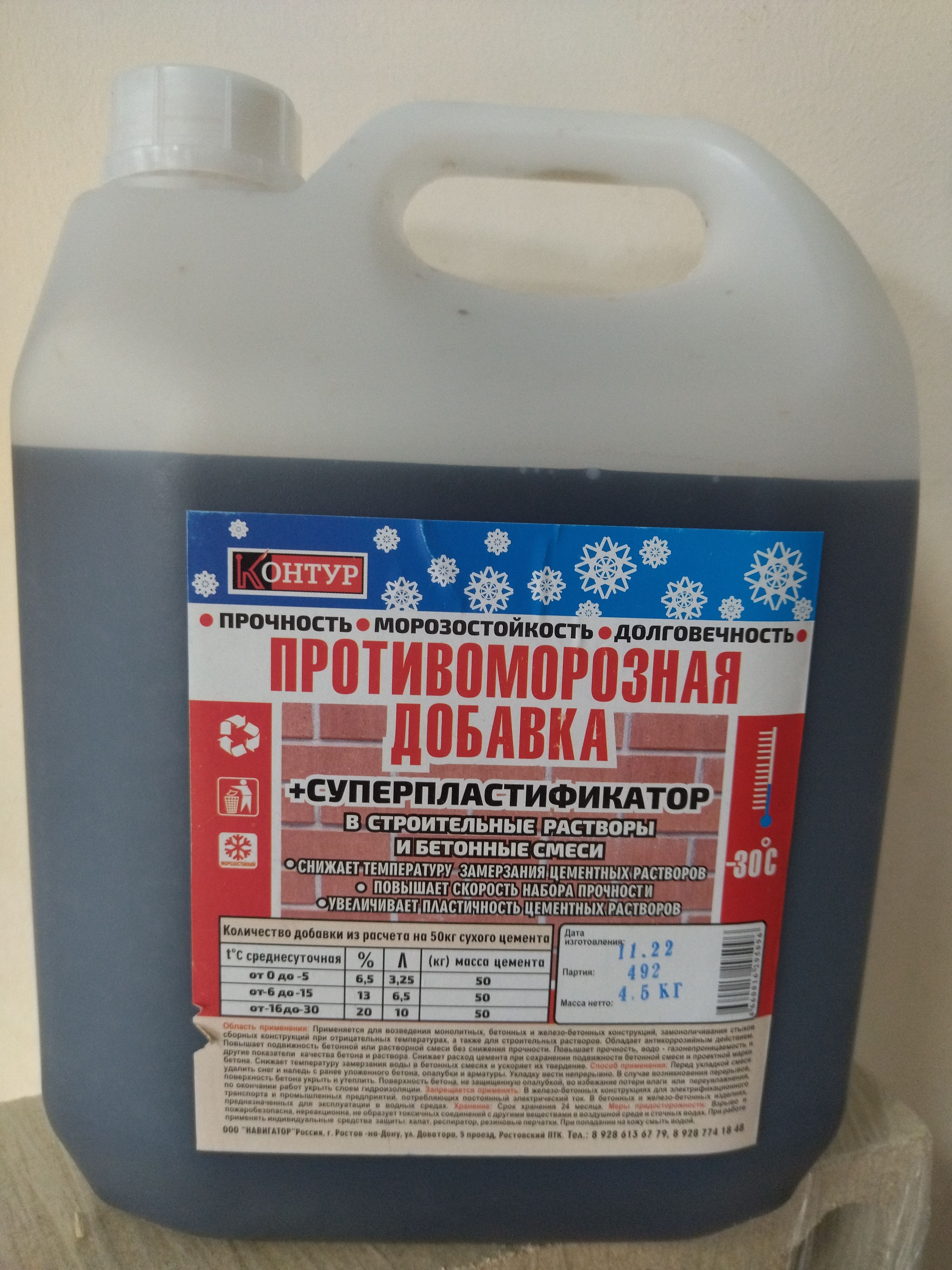 - Супер-антифризы (сильно понижают точку замерзания всего раствора). Концентрация: 3-5%. Пример: смесь хлорида кальция с карбамидом и нитритом кальция.