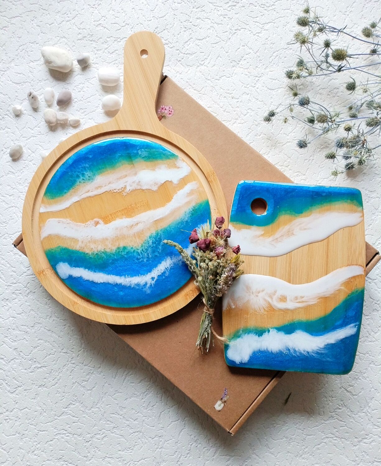 Эти удивительные разделочные доски создаются с использованием специальной эпоксидной смолы, которая позволяет запечатлеть реалистичные изображения морских волн, береговой линии и океанских просторов. Каждая доска представляет собой уникальную композицию, где натуральная текстура дерева гармонично сочетается с искусно выполненными художественными элементами.