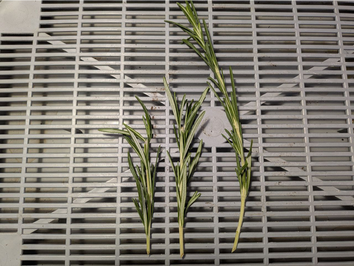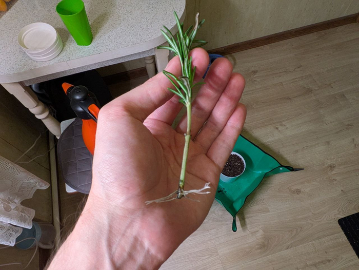 Вот так одну ветку я поделил на две части, макушку лучше сразу удалить, так розмарин будет расти более-менее ровно и начнёт хорошо куститься.