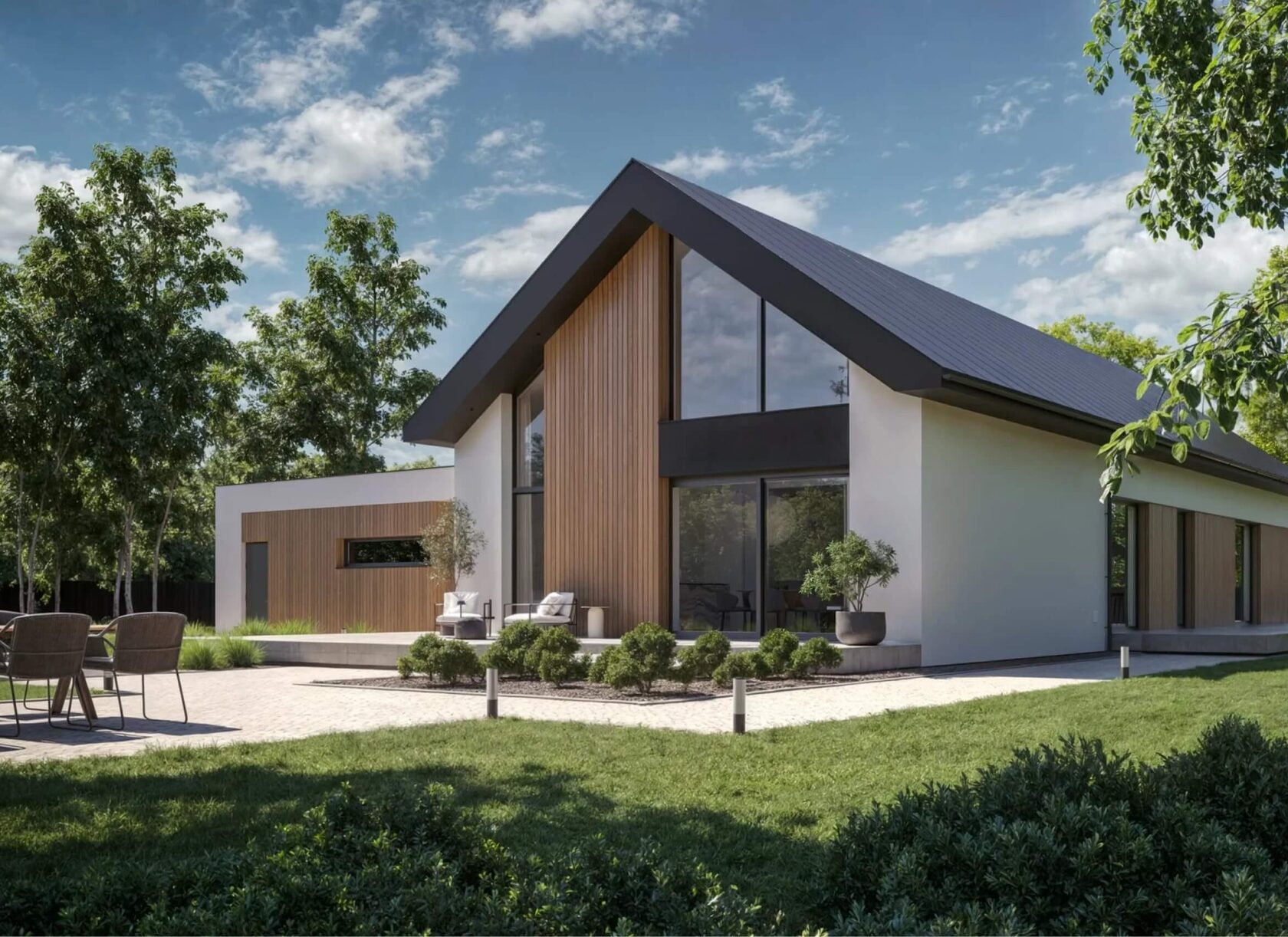 - Низкоскатная кровля, придающая дому элегантный европейский силуэт.
