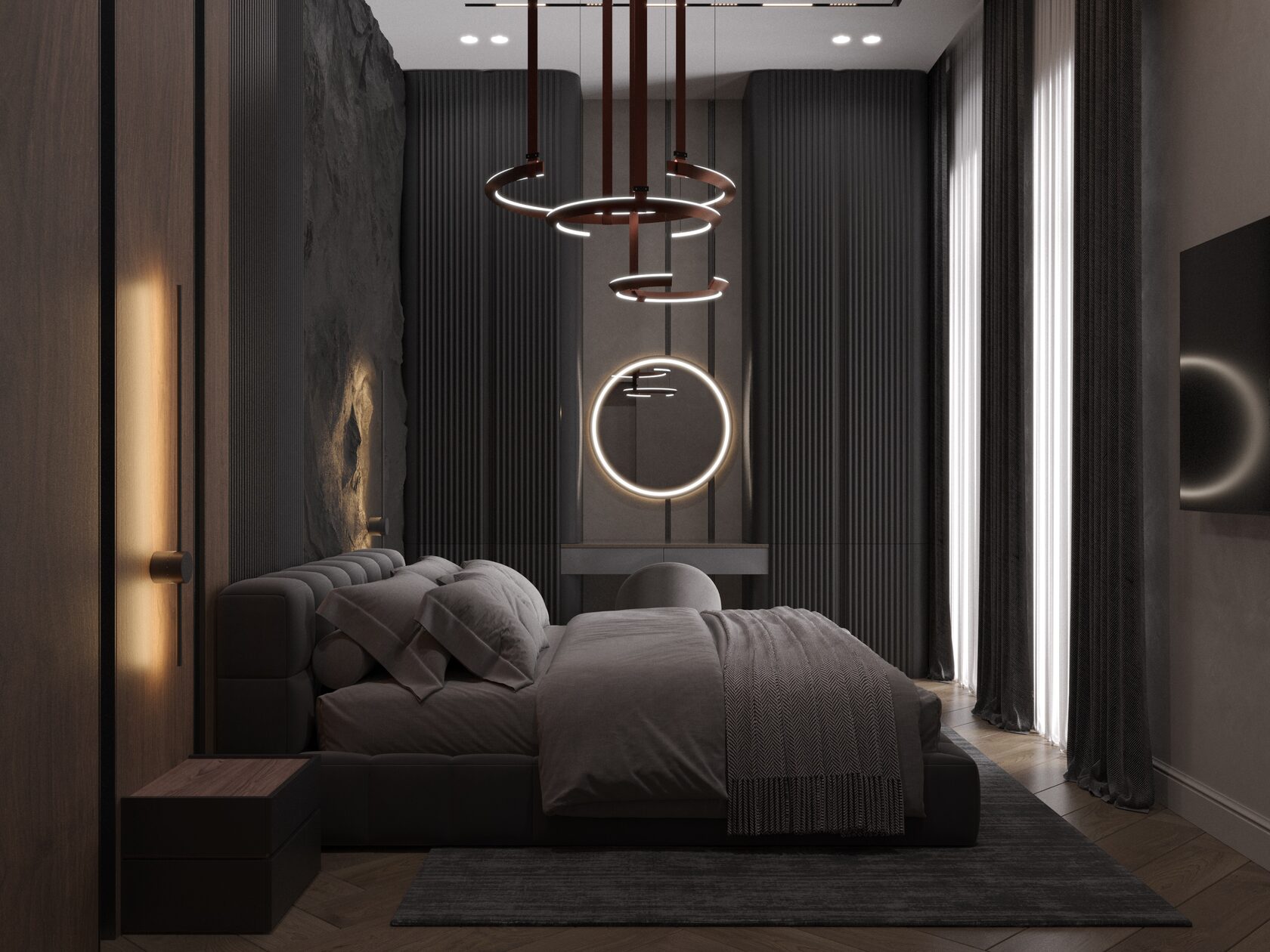 Центральным элементом этой дизайнерской спальни в Санкт-Петербурге стала люстра от итальянского бренда MULTIFORME. Модель CHAPEAU, выполненная из матового белого стекла в золотой оправе, является образцом высочайшего мастерства. Сложность ее изготовления с лихвой компенсируется невероятной красотой и изяществом, которые она привносит в интерьер.