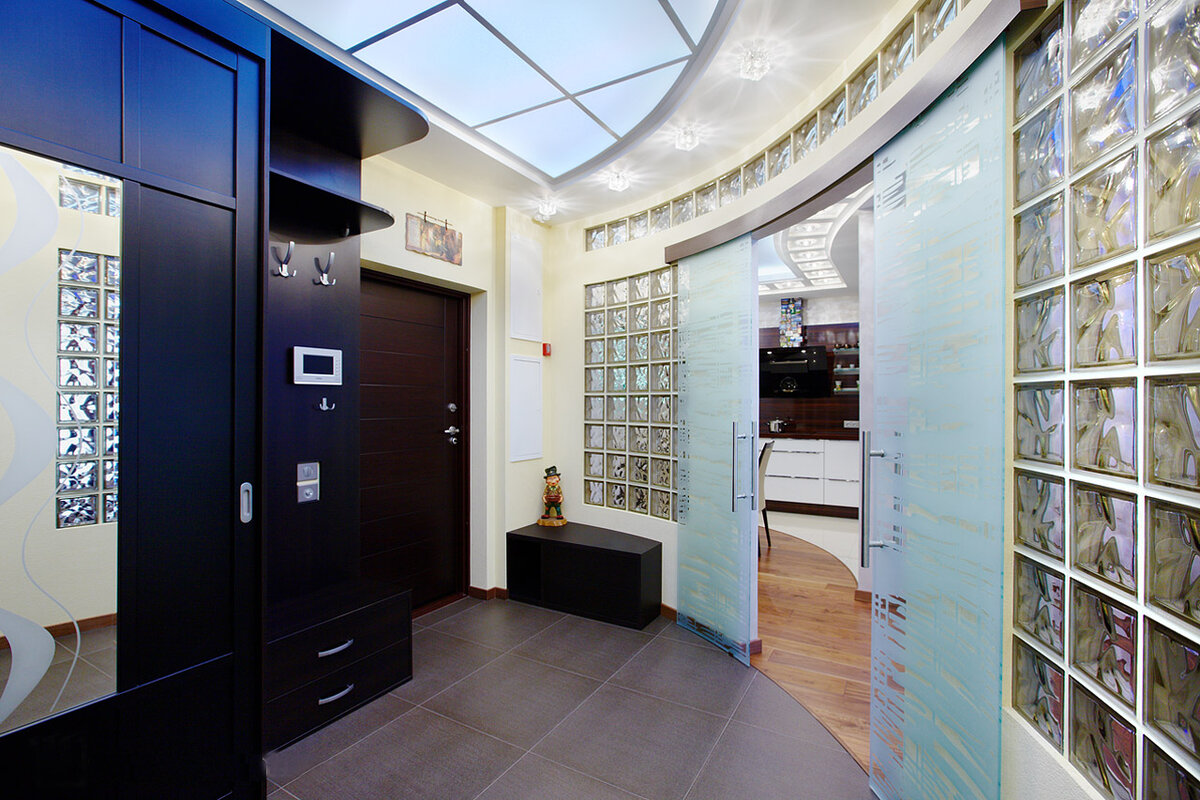 Стеклоблоками можно заменить часть стены в гардеробной, постирочной или узком коридоре, где нет места для большого окна. Для максимального освещения лучше выбирать прозрачные блоки.