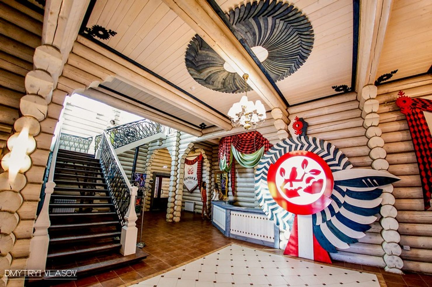 В холле гостей встречает великолепная деревянная лестница, изготовленная на заказ. Дизайнеры дополнили пространство яркой эксклюзивной символикой, а для отделки пола выбрали практичные и износостойкие материалы. В здании проведена система отопления, а потолок, благодаря грамотной подсветке и декору, выглядит особенно эффектно.