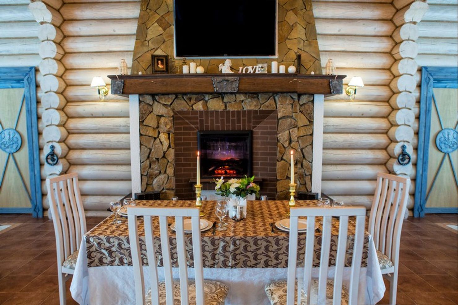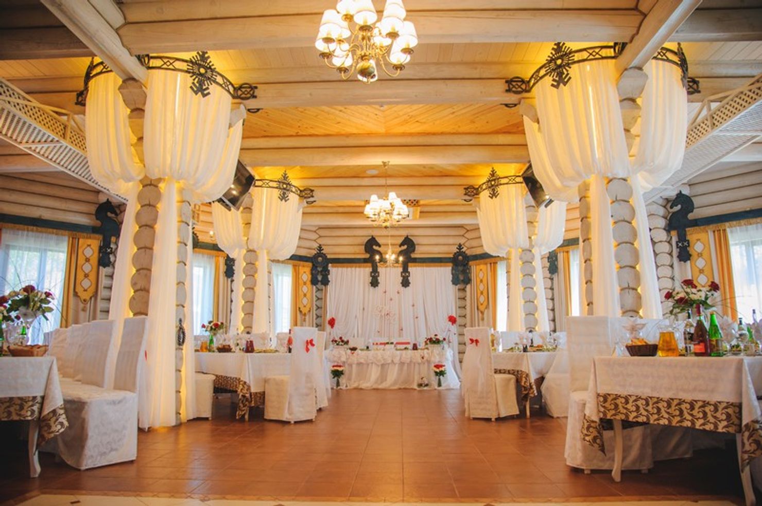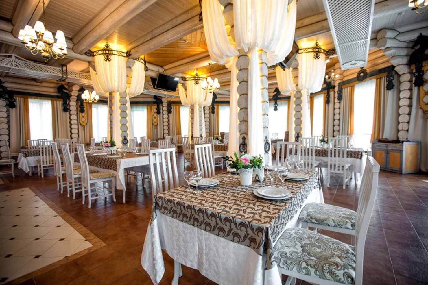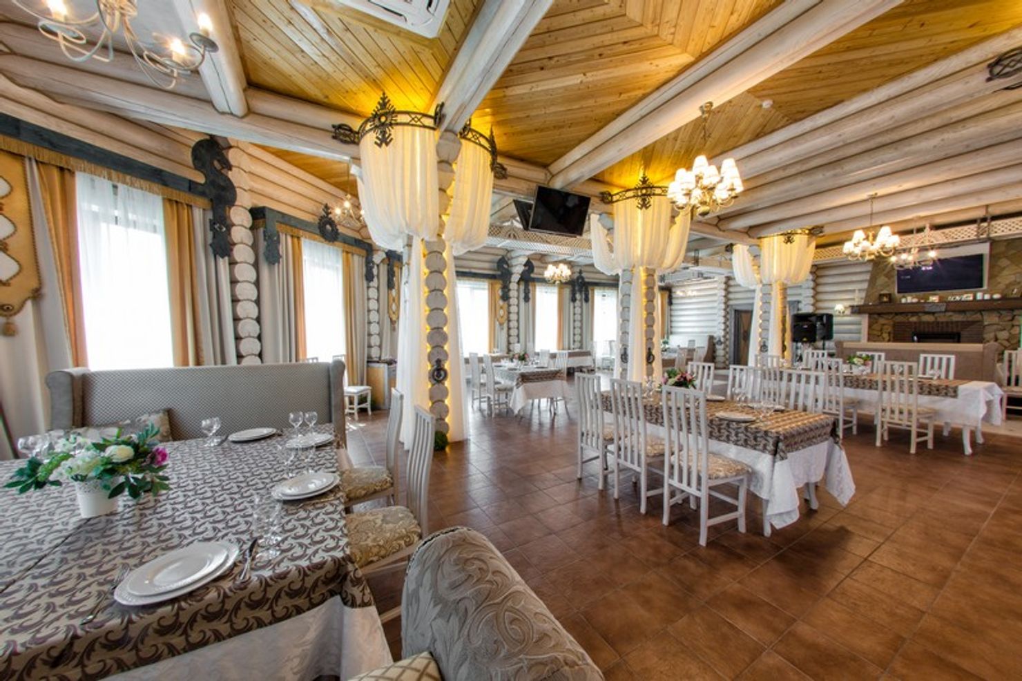 Роскошное оформление ресторана выдержано в стиле американского кантри и выглядит невероятно эстетично. Дизайнерам удалось подчеркнуть высоту потолков, визуально облегчить массивность деревянных конструкций и добавить теплый золотистый блеск с помощью изящных люстр, что создает особую, уютную атмосферу. Это пространство подходит не только для повседневных ужинов, но и для проведения торжественных мероприятий: свадеб, дней рождений и корпоративов.