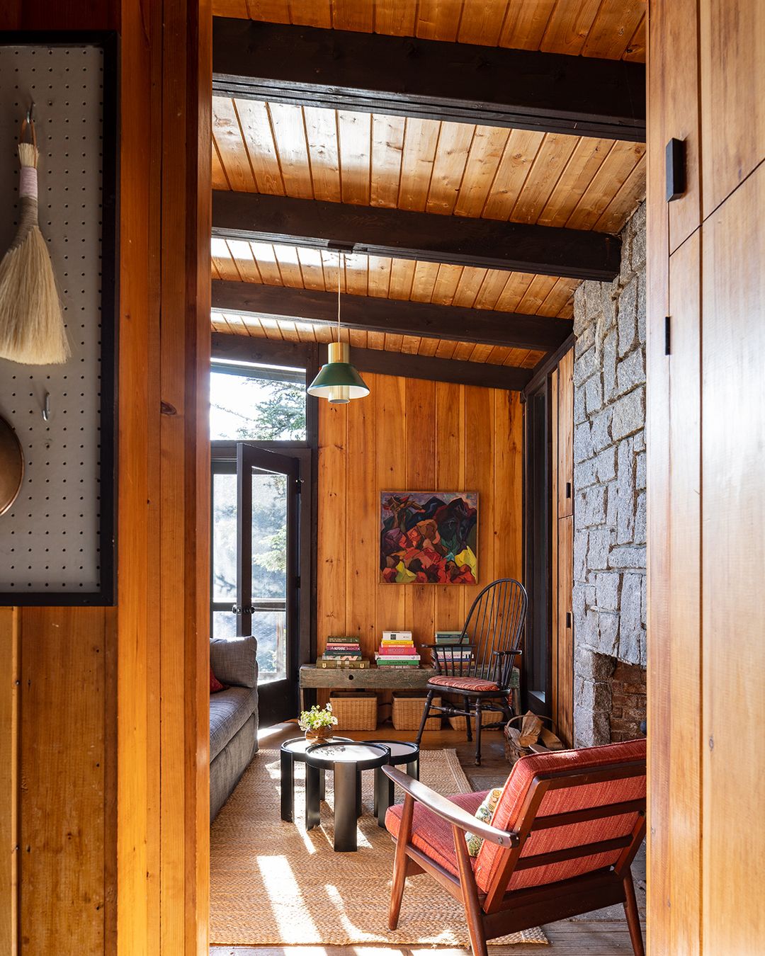 Этот дом, расположенный в США, является прекрасным примером того, как интерьер может гармонично слиться с окружающей природой и создать ощущение настоящей загородной жизни. Дизайн основан на использовании натуральных материалов: здесь доминирует дерево, добавляющее тепло, а также лён и шерсть, которые привносят мягкость и тактильный комфорт. Цветовая палитра полностью подчинена природным мотивам — используются успокаивающие зелёные оттенки, приглушённый синий, тёплая охра, насыщенный горчичный и нейтральный серый. Такое сочетание создаёт спокойную и расслабляющую атмосферу, идеальную для отдыха от городской суеты.