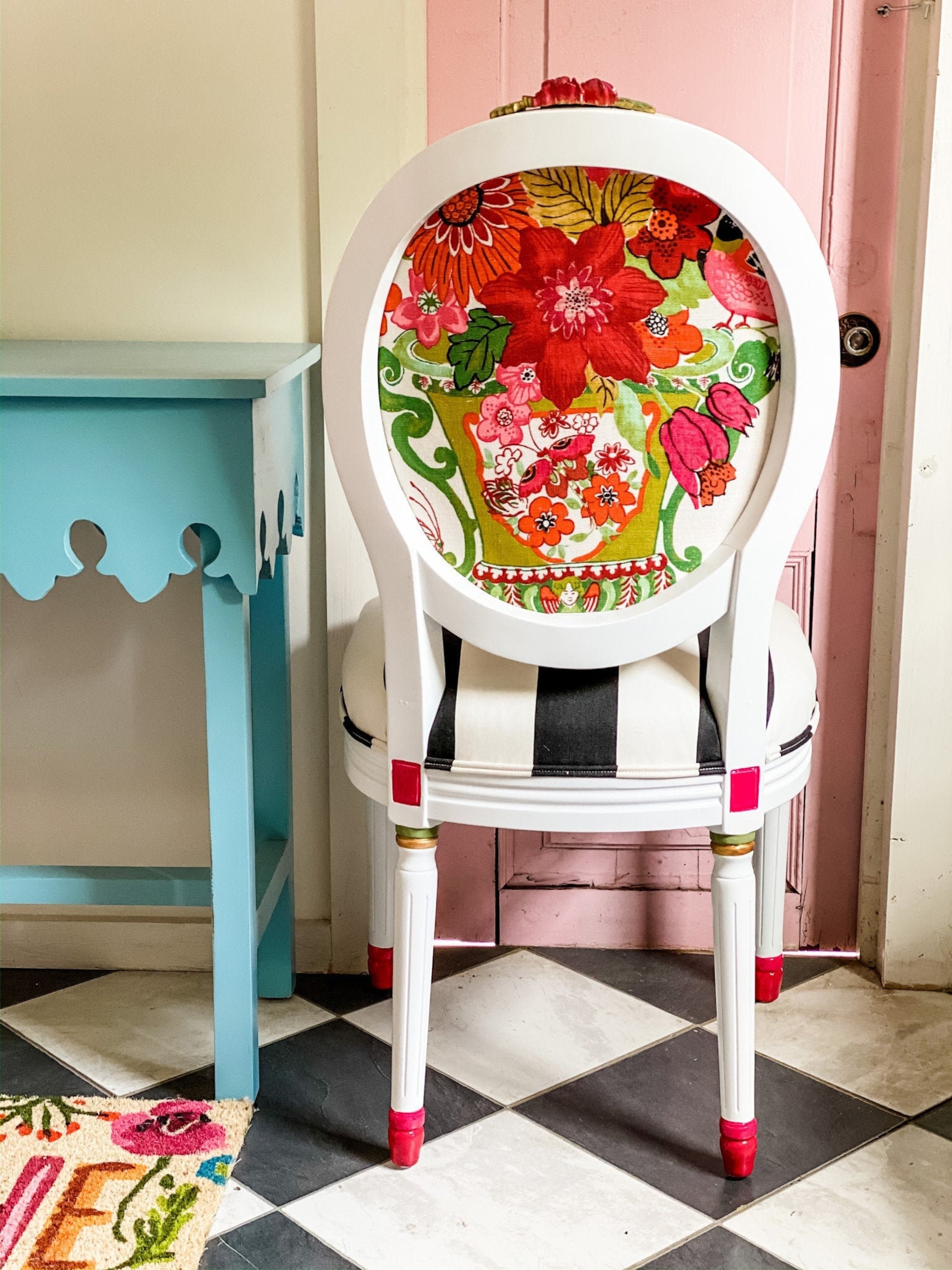 Для тех, кто хочет идти в ногу с трендами, есть более смелые и художественные подходы. Техника цветового блока (color blocking) предполагает использование крупных, четко очерченных плоскостей контрастных цветов. Например, можно окрасить спинку в ярко-розовый, а сиденье — в глубокий синий. Это создает очень графичный и современный образ.